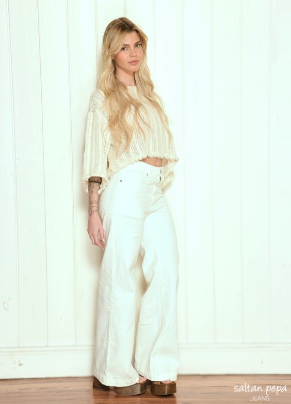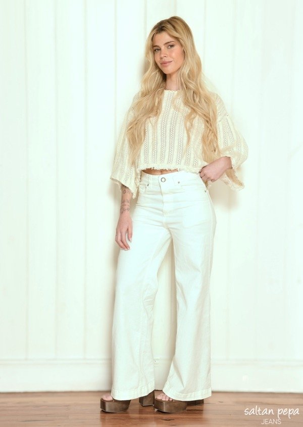 Jean wide leg blanco. Denim blanco elastizado, tiro alto.