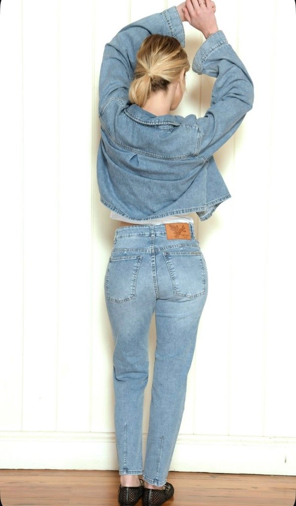 Jean mom fit elastizado.Tiro alto lavado gastado con pinza en botamanga.