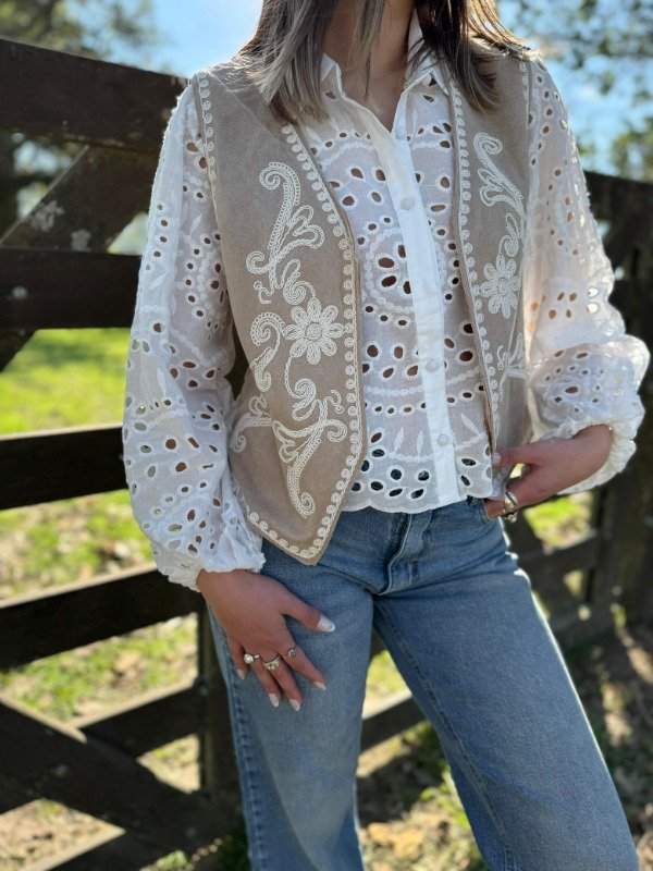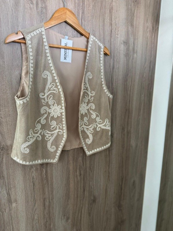 Chaleco gamuzado con detalles de bordados al frente. Interior forrado.