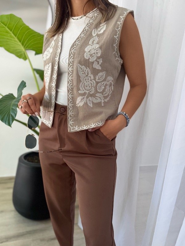 Chaleco de lino con frente y sisa bordado en relieve, atrás liso.