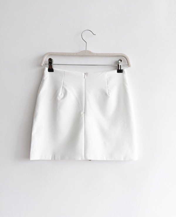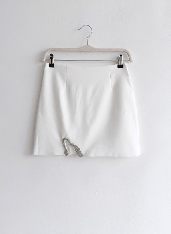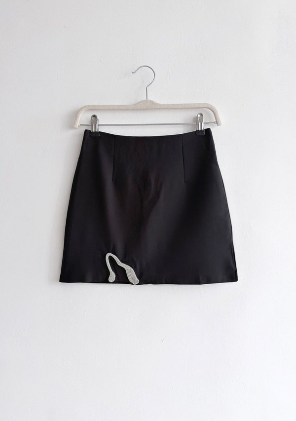 Minifalda de corte recto con aplique metálico con strass en borde inferior. Espalda lisa con cierre oculto y pinzas para mejor ajuste.