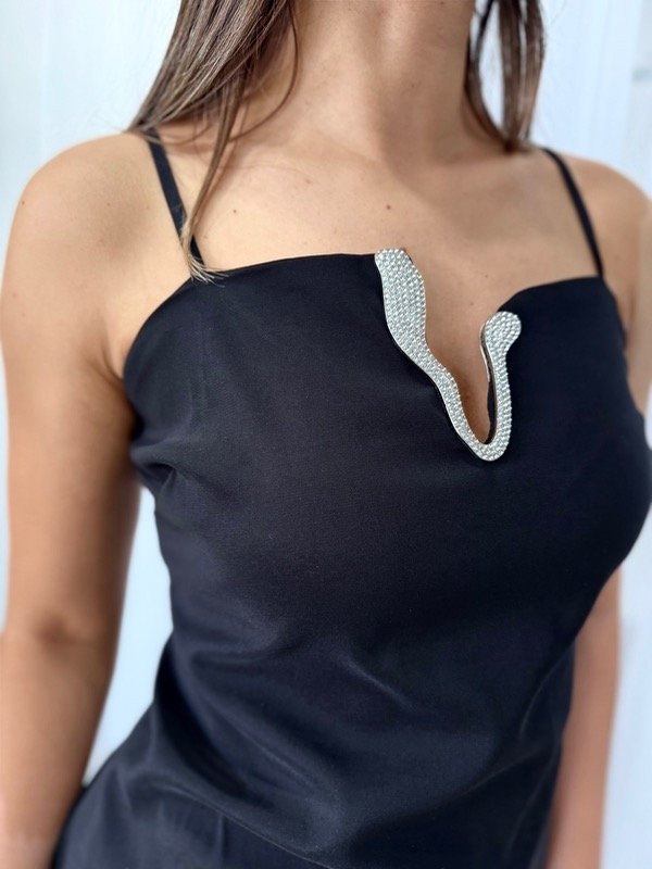Vestido corto de bretel fino con reguladores. Apertura por la espalda con cierre invisible. Detalle de avío metálico con strass en el escote delantero.