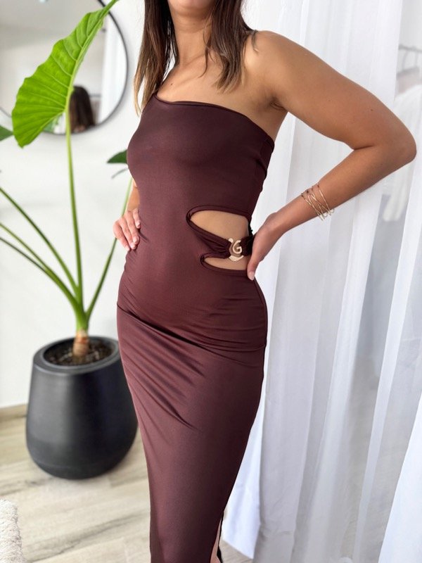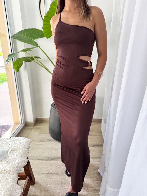 Vestido de un hombro con abertura en lateral y pasante.