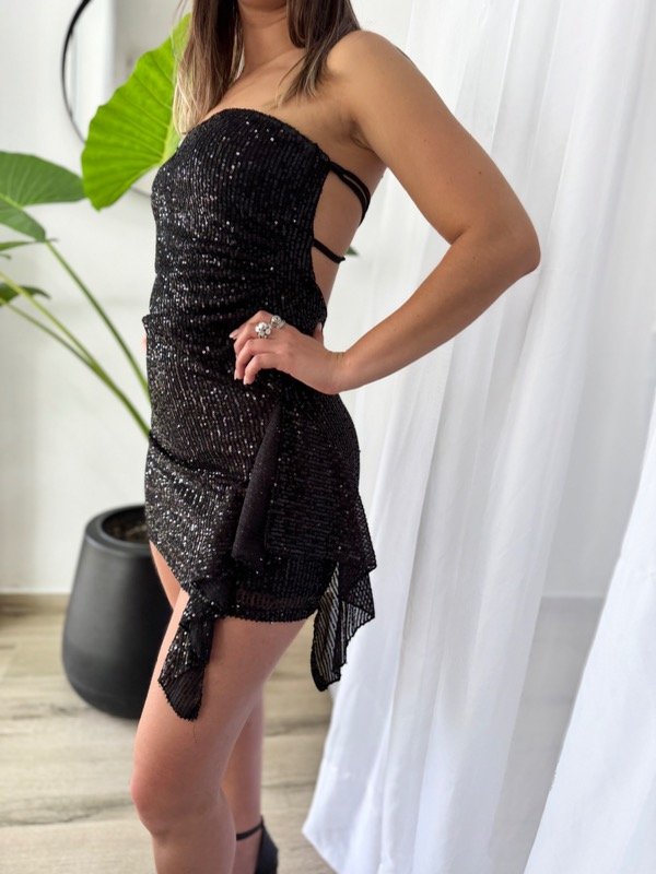 Vestido lentejuela straples con frunce y vuelo lateral con espalda descubierta.